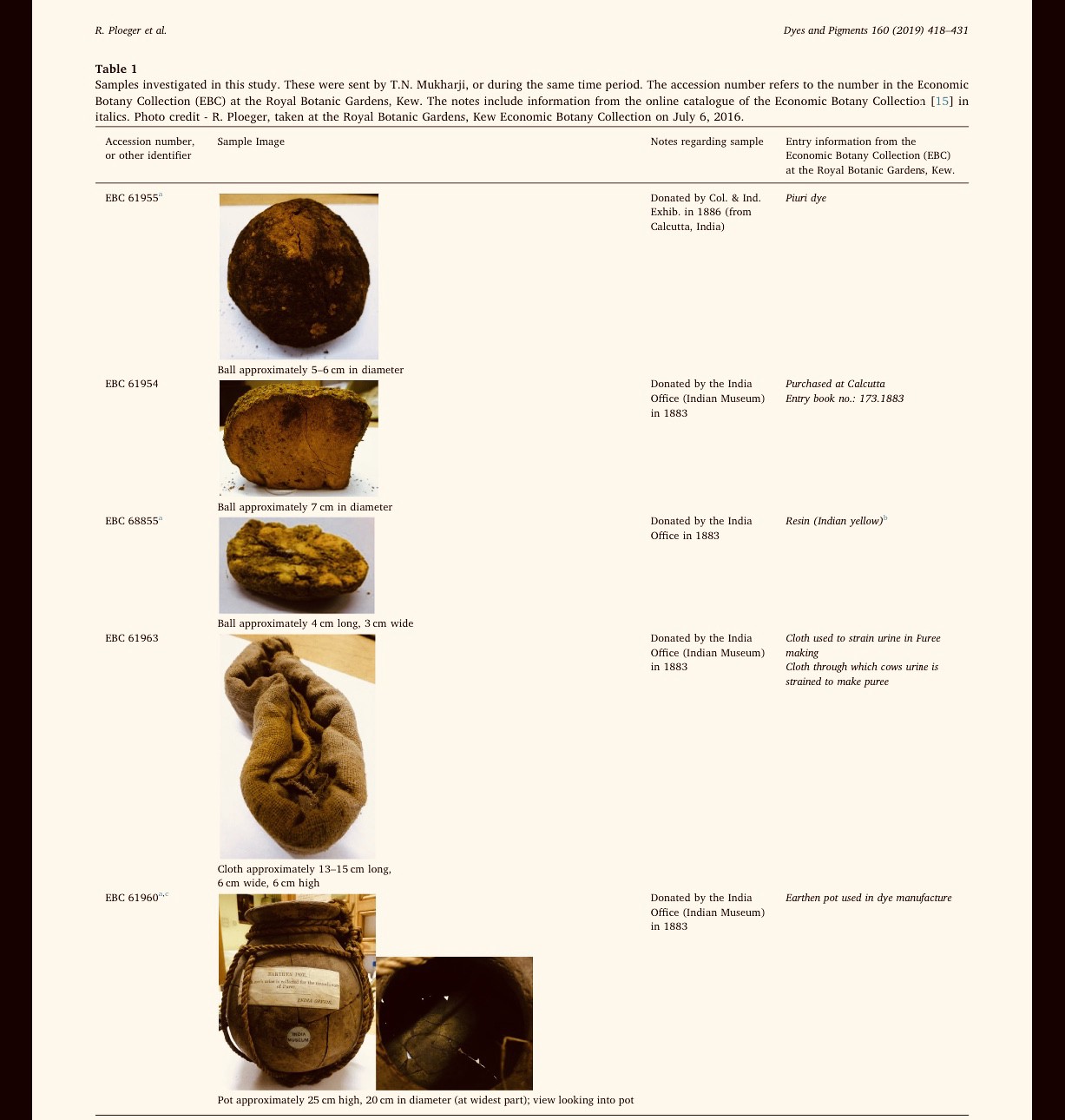 - R.Ploeger, A. Shugar, G.D. Smith and V.J. Chen, Late 19th century accounts of Indian yellow: The analysis of samples from the Royal Botanic Gardens, Kew Dyes and Pigments 160 (2019) 418–431 https://doi.org/10.1016/j.dyepig.2018.08.014